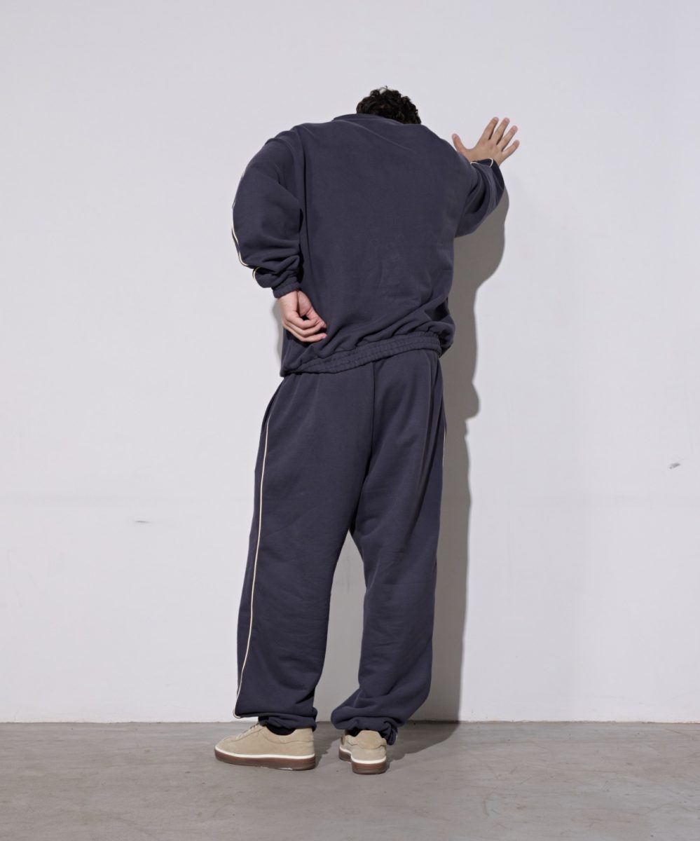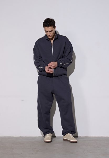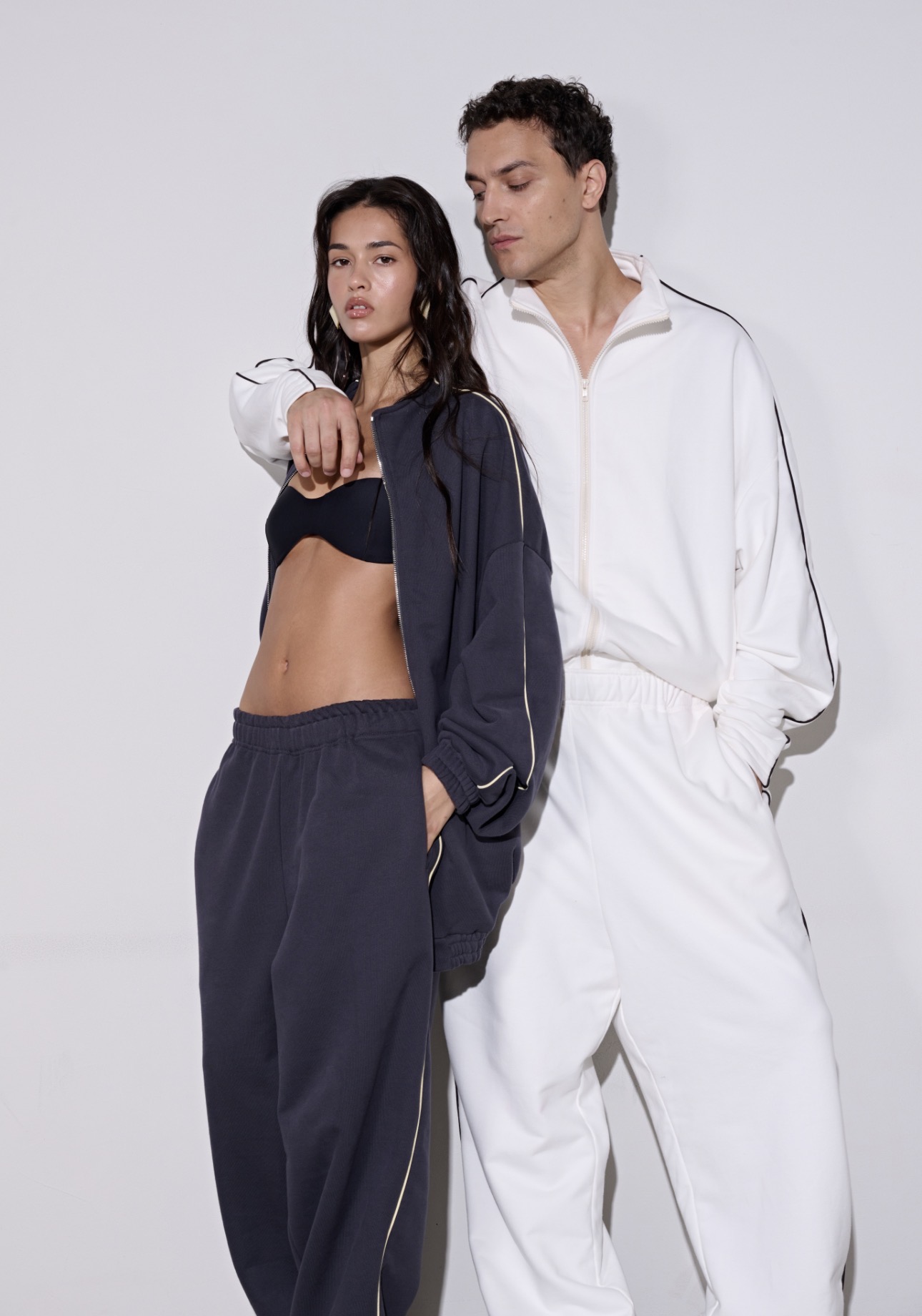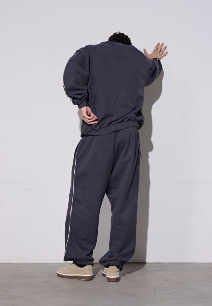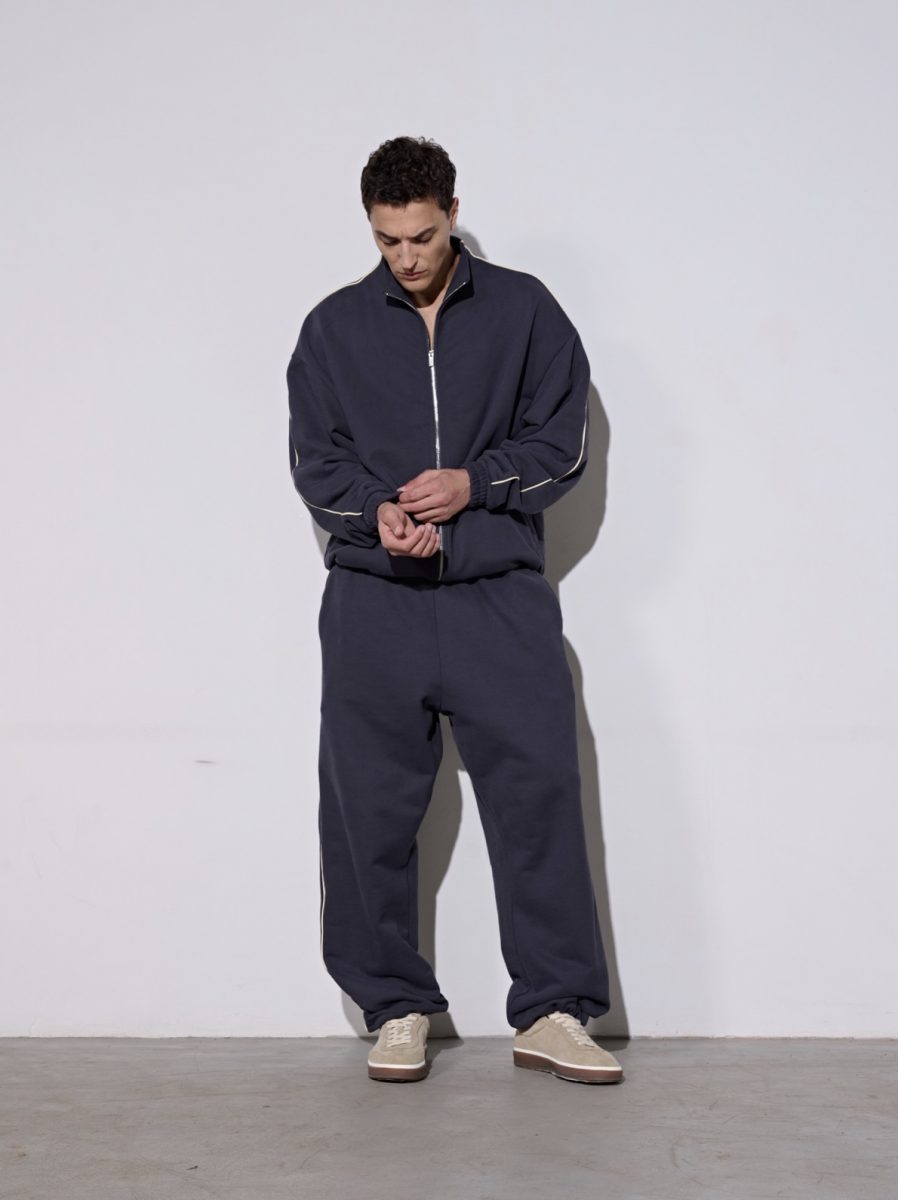 Брюки из хлопка с бархатной отделкой — мягкие, тактильно приятные, но держат форму. Посадка свободная, снизу комфортная резинка, создающая аккуратный объём и подчёркивающая спортивный стиль. Канты по бокам визуально вытягивают силуэт и добавляют динамики.