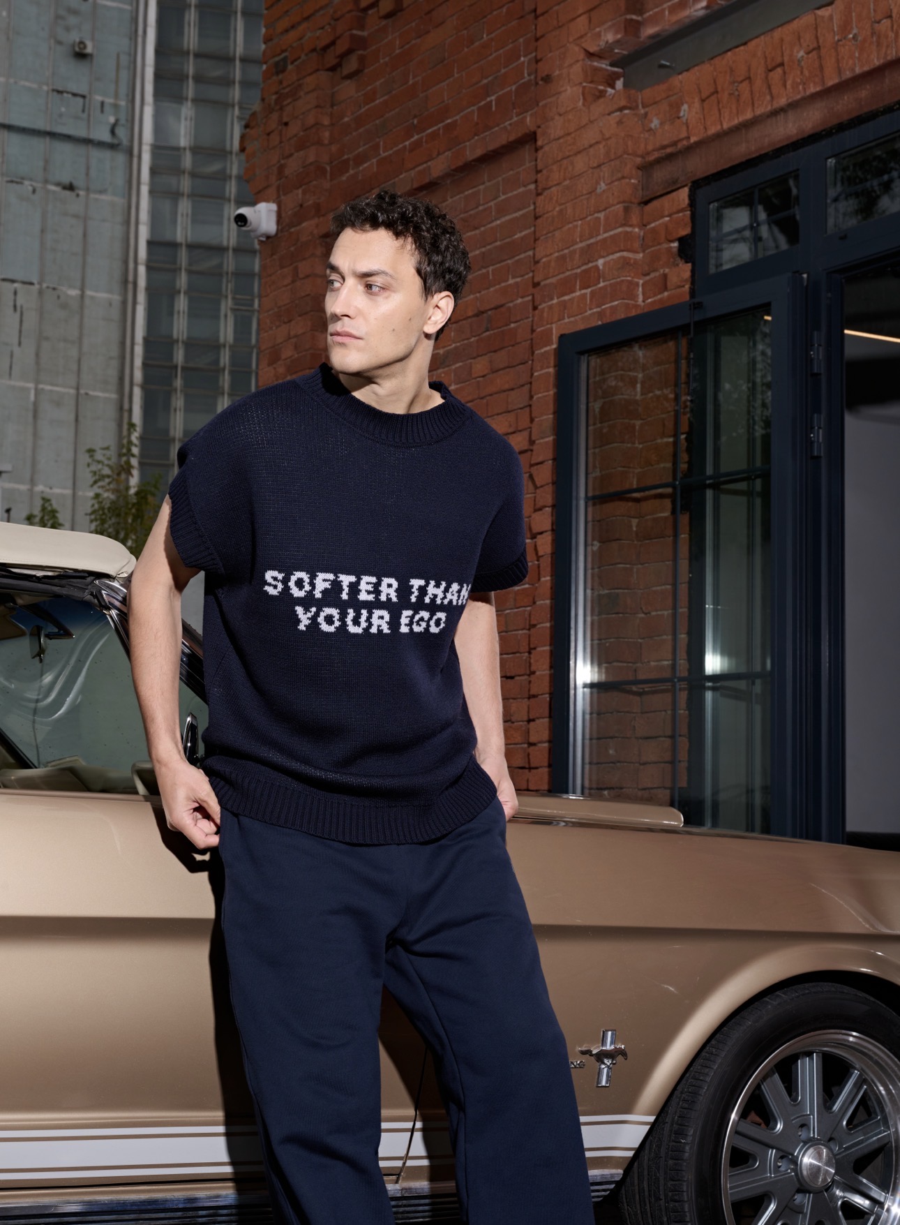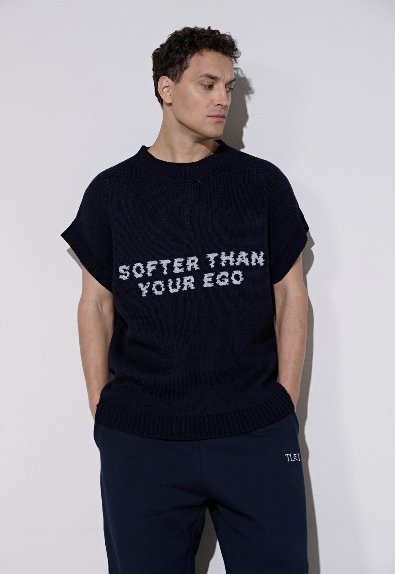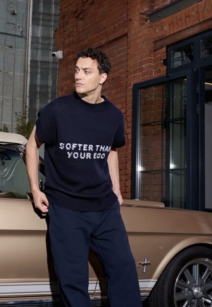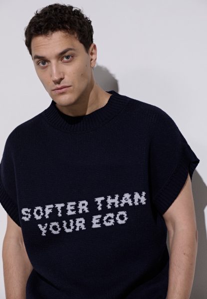 Жилет унисекс из шерсти в насыщенном синем цвете. Лаконичный силуэт, акцентная надпись SOFTER THAN YOUR EGO и мягкая текстура премиум-уровня. Легко вписывается в многослойные образы и сохраняет ту же уверенность, что и свитер.